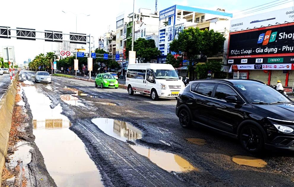 Ghi nhận của chúng tôi vào sáng ngày 4-11, đường Ngô Quyền đoạn đi qua địa bàn phường An Hải (TP Đà Nẵng) xuất hiện nhiều vị trí mặt đường bị bong tróc nặng đã tạo thành “ổ gà”, “ổ voi”, “sống trâu”; nhiều nút giao thông trên tuyến đường này, nhất là nút giao thông Ngô Quyền - Nguyễn Văn Thoại - Trần Thị Lý cũng có mặt đường bị hư hỏng tương tự, cộng thêm trời mua liên tiếp mấy ngày qua làm đọng nước trên các “ổ gà”, “ổ voi” gây mất an toàn giao thông.