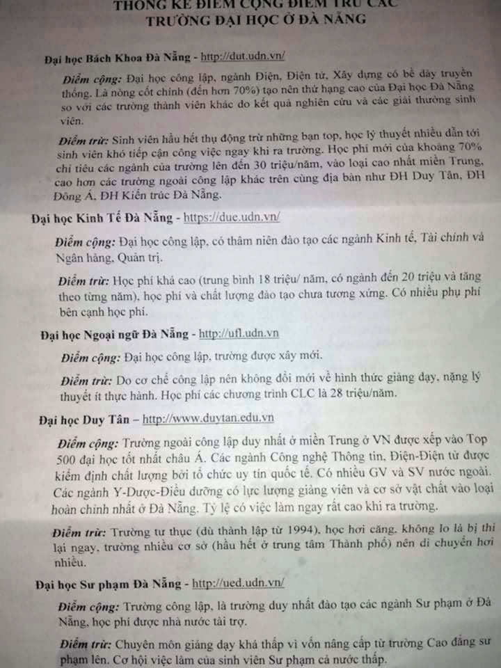 Theo phân tích của bộ "cẩm nang" này, ở trường ĐH Bách Khoa thì sinh viên hầu hết thụ động, học lý thuyết nhiều nên khó tiếp cận công việc ngay khi ra trường. Học phí vào loại cao nhất miền Trung... ĐH Kinh tế thì học phí khá cao, nhiều phụ phí, chất lượng đào tạo chưa tương xứng. ĐH Ngoại ngữ thì cơ chế công lập nên không đổi mới về hình thức giảng dạy, nặng lý thuyết, ít thực hành. ĐH Sư phạm chuyên môn giảng dạy khá thấp vì nâng cấp từ hệ Cao đẳng lên, cơ hội việc làm sau khi ra trường khó khăn. ĐH Kiến trúc thì khá sơ sài, chưa có nhiều thành tích, tên trường dễ bị hiểu nhầm, mở nhiều ngành học để thu hút nguồn thu. ĐH Đông Á nâng cấp lên từ trường Cao đẳng, chất lượng đào tạo thấp, nhiều điều tiếng trong những năm gần đây.