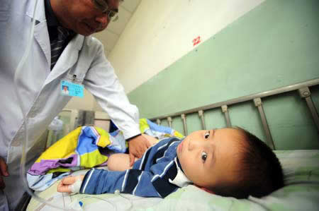 Một em nhỏ bị sỏi thận do dùng sữa Sanlu được điều trị tại bệnh viện ở Lan Châu, |