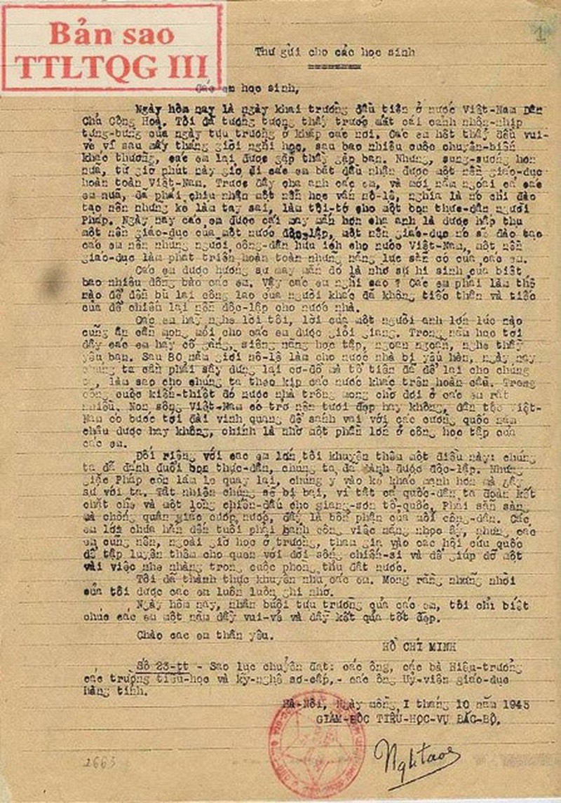 Ngày 5-9-1945, Bác Hồ đã viết “Thư gửi cho các học sinh” nhân ngày khai giảng năm học đầu tiên của nước Việt Nam Dân chủ Cộng hòa. Ảnh tư liệu |