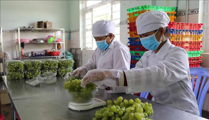 Sơ chế, đóng gói sản phẩm nho xanh tại Công ty TNHH Sản xuất và Thương mại nông sản Thái Thuận. |