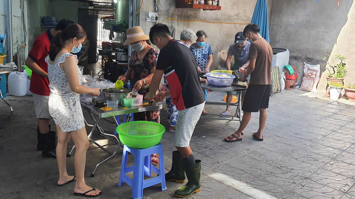 Chị Nguyễn Thị Thanh Hà là người trực tiếp đứng bếp cho hay, biết được hoạt động ý nghĩa của mọi người ở đây nên chị tình nguyện đến hỗ trợ. Mỗi người một việc, bắt đầu từ 7 giờ sáng đến hơn 10 giờ trưa để kịp thời làm xong những suất cơm tặng người nghèo. “Trong giai đoạn dịch bệnh nguy hiểm thế này, mọi người cũng ý thức được vấn đề phòng chống dịch nên khi tham gia nấu nướng ai cũng rất cẩn thận. Các tình nguyện viên và bà con nhận cơm cũng tuân thủ nghiêm quy định phòng chống dịch. Mong là dịch chóng qua để bà con bớt khổ, cuộc sống sớm quay trở lại bình thường”, chị Hà bộc bạch.