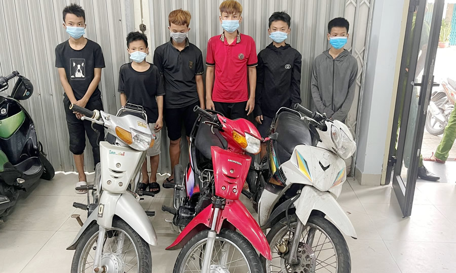 Nhóm “sửu nhi” cùng tang vật là 3 chiếc xe máy trộm được trong ngày 26-7. |