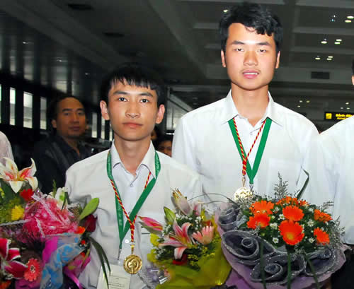 Lê Ngọc Anh (trái) và Hoàng Đức Ý trở về với 2 HCV IMO 2008. Ảnh: TTXVN |