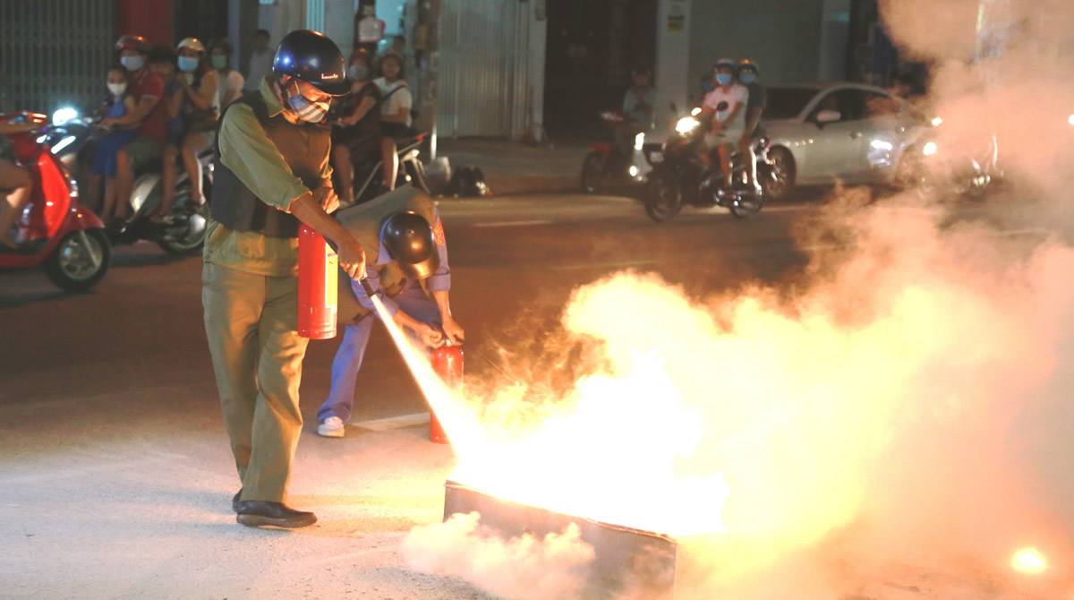 Lực lượng BVDP P. Thạch Thang tham gia huấn luyện phương án chữa cháy tại khu dân cư. |