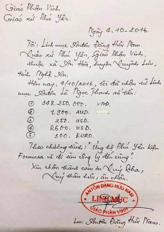 Hóa đơn nhận tiền được viết tay của ông Đặng Hữu Nam vào ngày 4-10-2016 ghi cụ thể: “Tôi, linh mục An tôn Đặng Hữu Nam, quản xứ Phú Yên, thuộc xã An Hòa, H. Quỳnh Lưu, Nghệ An đã nhận từ linh mục An tôn Lê Ngọc Thanh 5 khoản với số tiền: 348.250.000 đồng, 10.900 USD và 300 EUR” đã phần nào nói lên được bản chất của vụ việc, những hành vi khuất tất cũng như sự manh động của vị linh mục này trong thời gian gần đây.