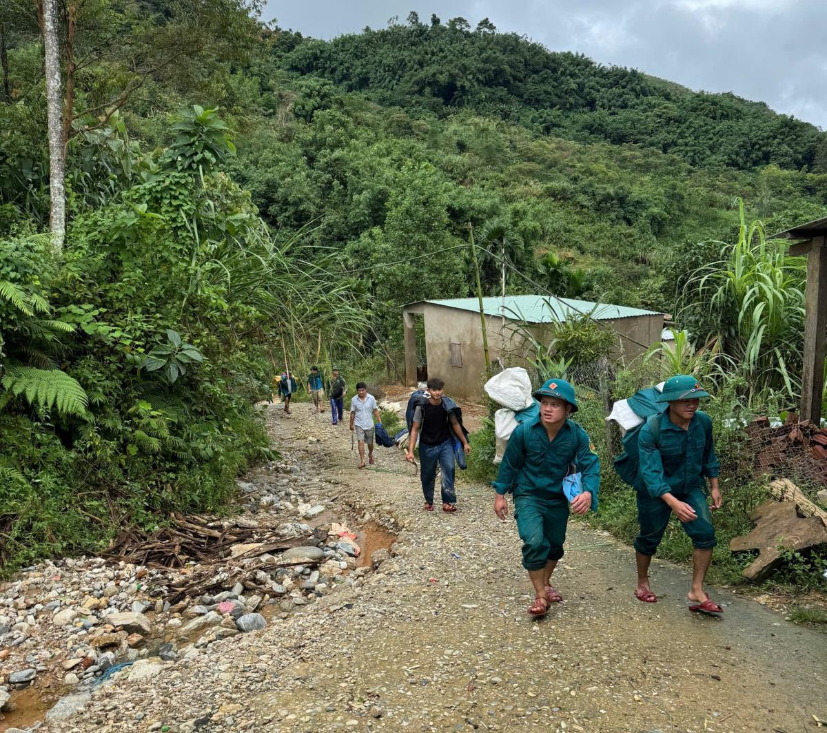 Trong ngày 30-10, tranh thủ thời tiết tạnh ráo, Ban chỉ huy PCTT&PTDS xã Trà Leng thành lập nhiều tổ công tác băng rừng, vượt suối gùi lương thực tiếp tế cho các bản, làng đang bị sạt lở chia cắt.
