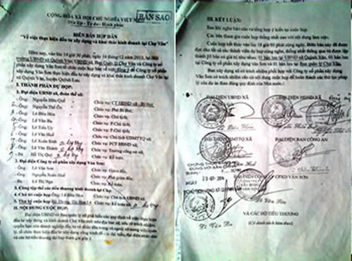 Tuy nhiên “biên bản họp dân” này là giả mạo bởi vì vào hồi 14 giờ 30 ngày 16-12-2013, ông Lê Đôn Hóa - Chủ tịch UBND xã Quỳnh Văn đang chủ trì phiên họp chuyển đổi đất theo Chỉ thị 08 của tỉnh Nghệ An với bí thư chi bộ và thôn trưởng thôn 4, không thể chủ trì buổi họp dân về khai thác và xây dựng chợ Vân như biên bản đã nêu. Bên cạnh đó, thành phần cuộc họp được liệt kê là 10 người nhưng có 4 người tự nhận là không có mặt, chỉ ký và đóng dấu khi “có người” đưa biên bản tới. Thực chất "biên bản họp dân" này do Cty Văn Sơn soạn thảo rồi đưa cho từng cán bộ ký tên, đóng dấu chứ không có bất kỳ cuộc họp nào. Trong Thông báo số 208 ngày 27-4-2015 của Ủy ban Kiểm tra Huyện ủy Quỳnh Lưu do chủ nhiệm Lê Văn Lương ký đã chứng minh điều này: “Việc UBND xã Quỳnh Văn không tổ chức họp với các hộ tiểu thương kinh doanh tại chợ Vân nhưng vẫn lập biên bản họp ngày 16-12-2013 là đúng thực tế”.