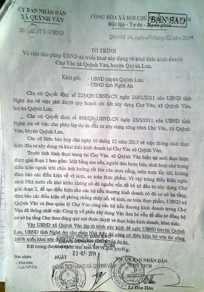 Sau khi có “biên bản họp dân” với 5 chữ ký, 5 con dấu, ngày 21-1-2014, Chủ tịch UBND xã Quỳnh Văn - Lê Đôn Hóa đã làm Tờ trình số 10 gửi UBND H. Quỳnh Lưu, UBND Nghệ An với đề nghị: “Cho phép Nhà thầu thi công là Cty Văn Sơn bỏ vốn xây dựng 100% theo đúng quy mô được duyệt, và thực hiện kinh doanh, khai thác 50 năm sau khi chợ hoàn thành”.