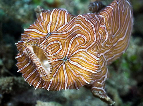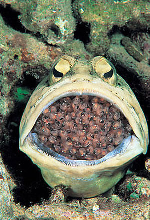 Trong ảnh là một con cá đực đang ngậm trứng trong miệng. Sau khi giao phối, cá mái sẽ chuyển trứng qua cá đực ấp. Loài các này chỉ sống ở vùng biển