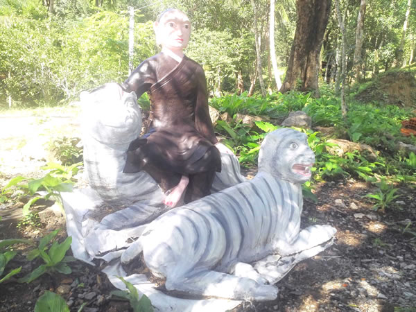 Tượng nhà sư thu phục 2 mẹ con cọp trắng ở chùa Thắng Quang. |