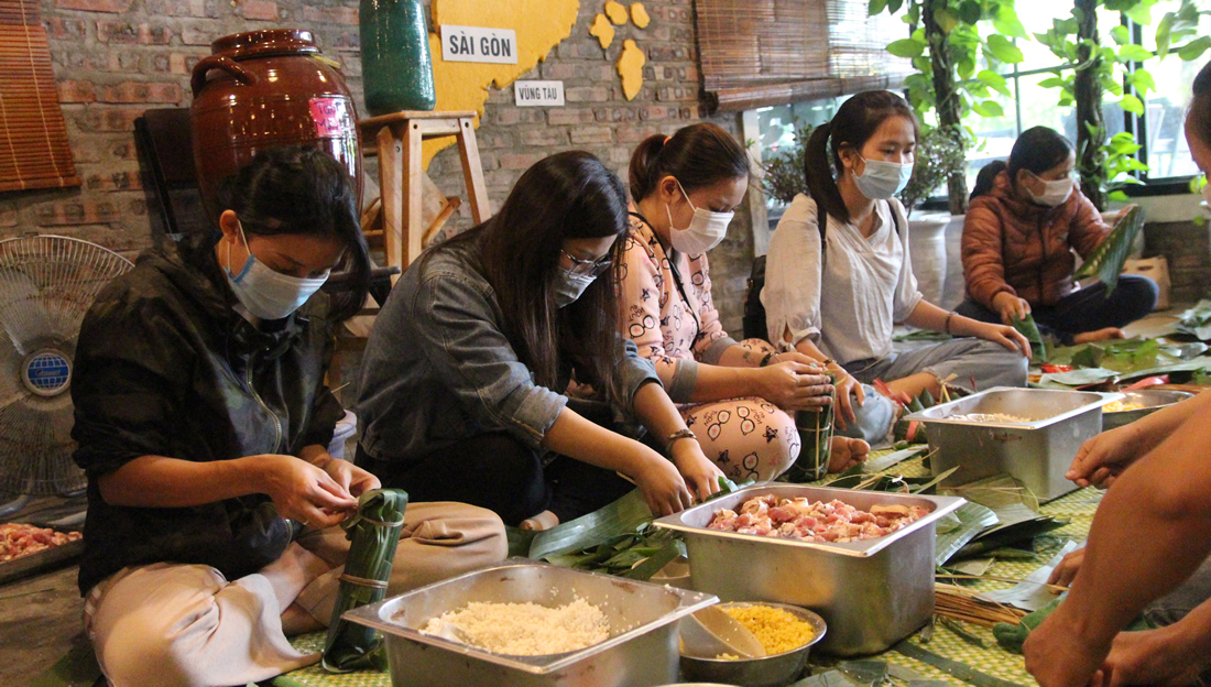 Người dân tham gia gói bánh chưng hướng về đồng bào gặp thiên tai tại miền Trung ở địa chỉ 105 đường Hồ Nghinh (Q. Sơn Trà, Đà Nẵng) |