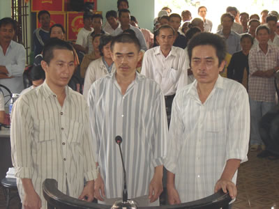 Các bị cáo Hanh, Lộc, Khanh tại phiên tòa lưu động. |
