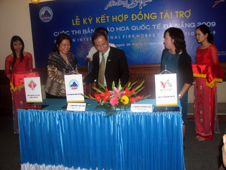 (Cadn.com.vn) - Ngày 5-2, UBND TP Đà Nẵng phối hợp với Cty CP Nghệ thuật Việt (VietArt) tổ chức lễ ký kết hợp đồng tài trợ Cuộc thi bắn pháo hoa quốc tế Đà Nẵng 2009. Tính đến thời điểm hiện tại, đã có gần 30 doanh nghiệp ủng hộ, ký kết hợp đồng tài trợ cho cuộc thi với tổng số tiền lên đến hơn 9,64 tỷ đồng, trong đó, có 3 nhà tài trợ Bạc: Cty CP Địa Cầu, Cty CP Địa ốc ô-tô Phương Trang với cùng số tiền 1,75 tỷ đồng và Cty TNHH CP Đức Mạnh 875 triệu đồng; 1 nhà tài trợ ĐồNG là Cty TNHH Nhà máy bia Việt Nam số tiền 1,2 tỷ đồng cùng với những nhà đồng tài trợ gồm: Cty XDCT Giao thông 5 tài trợ 500 triệu đồng, Cty CP XDCT 586 tài trợ 500 triệu, Cty CP Đầu tư XD và Phát triển Hạ tầng Nam Việt Á 500 triệu, Cty CP Địa ốc Viễn Đông Việt Nam 500 triệu, Cty TNHH The Nam Khang 300 triệu, Cty CP Sài Gòn-Đà Nẵng 200 triệu, Cty CP XD 79 175 triệu, Cty TNHH Trung tâm Thương mại VinaCapital 150 triệu, Cty TNHH Du lịch biển VinaCapital 150 triệu, Viễn thông Đà Nẵng 100 triệu, Bài Thơ Group 100 triệu, Cty TNHH Thương mại Dịch vụ và Xây lắp điện Thư Dung 100 triệu, Cty CP Thủy điện Geruco Sông Côn 100 triệu, Cty Bảo hiểm Bảo Việt Đà Nẵng, Cty Bảo hiểm Bảo Minh Đà Nẵng, Cty Bảo hiểm Dầu khí khu vực Đà Nẵng, Chi nhánh Cty CP Bảo hiểm Petrolimex miền Trung 400 triệu, Cty CP XDCT Giao thông 545 - 50 triệu, Cty CP Đầu tư Nam Long 50 triệu, Ngân hàng NN&PTNT Việt Nam-CN Đà Nẵng 50 triệu, Cty CP Kim khí miền Trung 50 triệu, KS Hoàng Trà 30 triệu, Cty Bảo hiểm Prudential-CN Đà Nẵng 20 triệu, Ngân hàng Công Thương Việt Nam-CN Đà Nẵng 20 triệu, Cty CP Dược phẩm Danameco 10 triệu và Cty CP Tư vấn và XD EEC 10 triệu.