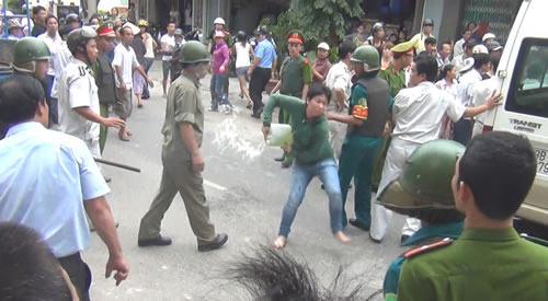 | Bà Thảo (vợ ông Minh) tạt xăng vào các phương tiện và những người làm nhiệm vụ. |
