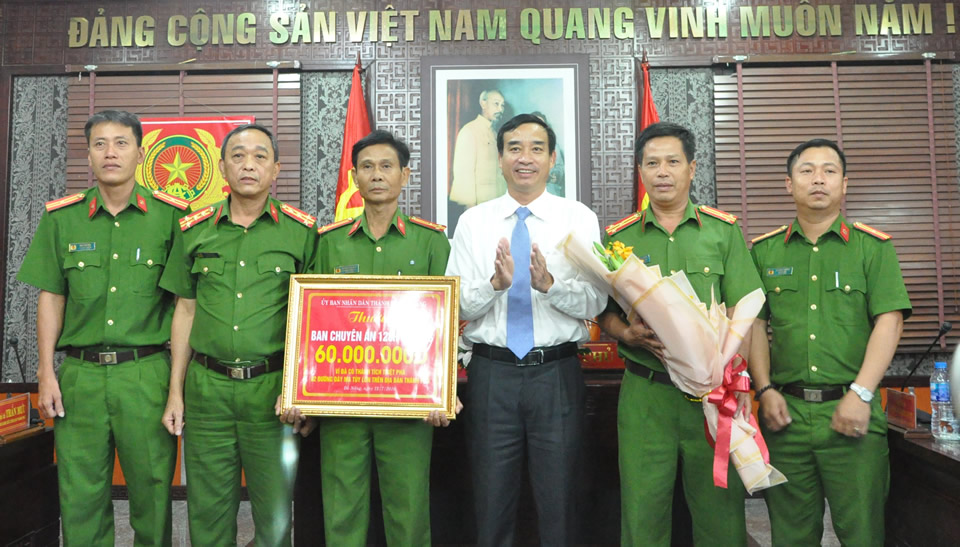 Phó Chủ tịch UBND TP Đà Nẵng Lê Trung Chinh chúc mừng và trao thưởng 60 triệu đồng cho Phòng Cảnh sát Điều tra tội phạm về ma túy về thành tích phá 2 chuyên án ma túy. |