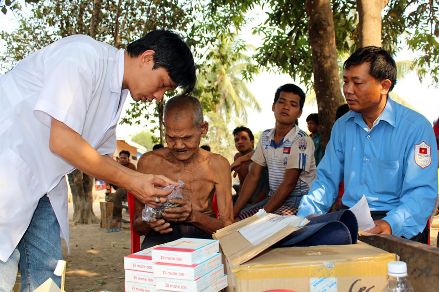 Quân y Bộ CHQS tỉnh khám bệnh, cấp thuốc cho nhân dân Campuchia. |