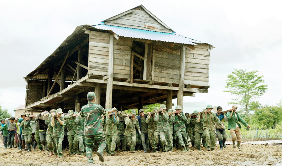 "Thần đèn" bộ đội thực hiện nhiệm vụ di dời nhà trên núi. |