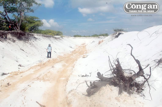 (Cadn.com.vn) - Tại Quảng Nam, lợi dụng dự án đường cứu hộ, cứu nạn ven biển đang triển khai, hàng đêm, các đối tượng dùng xe cơ giới lén lút khai thác cát trắng trái phép. Mặc dù sự việc trên đã được các ngành chức năng phát hiện, xử lý, song theo ghi nhận của chúng tôi, nguồn cát trắng dọc tuyến đường này vẫn bị "rút ruột" mỗi đêm.