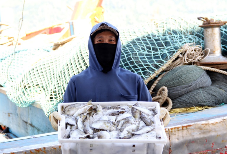 Hơn 12 ngày đánh bắt trên biển, ông Hồ Văn Sơn (44 tuổi, quê Quảng Ngãi, chủ tàu cá QNg 92016) cùng bạn thuyền mang hơn 25 tấn "chiến lợi phẩm" cập cảng để bán cho thương lái. "Dù Đà Nẵng đang có dịch COVID-19 nhưng việc bán cá vẫn diễn ra bình thường, chợ mở cửa là có người đến mua cá. Sau chuyến này, tôi và 15 thuyền viên trên tàu sẽ về nghỉ Tết bên gia đình, người thân", ông Sơn cho hay.