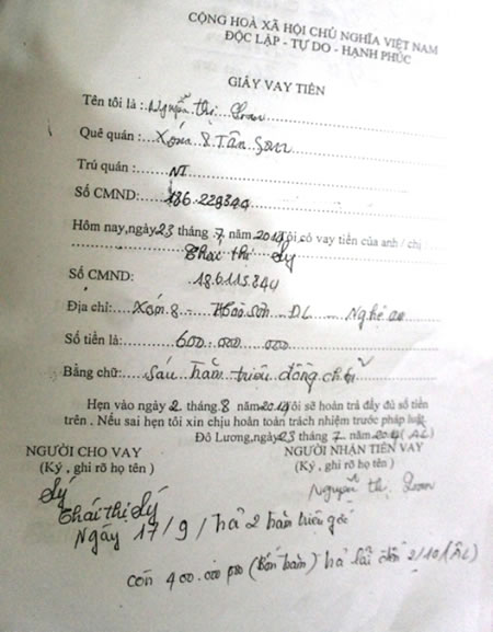 Cho vay hàng tỷ đồng nhưng người dân chỉ nhận được giấy vay tiền đơn giản do Loan tự đánh máy. |