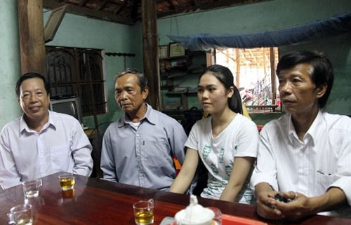 | Ban Giám hiệu nhà trường và hàng xóm đến chúc mừng thành tích thủ khoa của Phượng. |