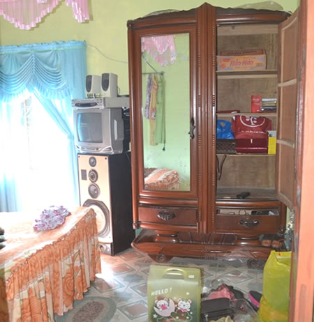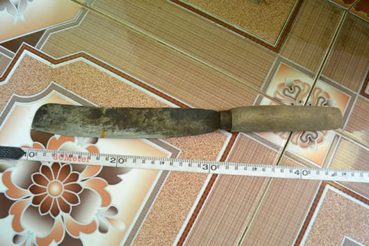 Con dao gây án và đồ đạc trong phòng ngủ của nạn nhân bị đối tượng lục tung. |