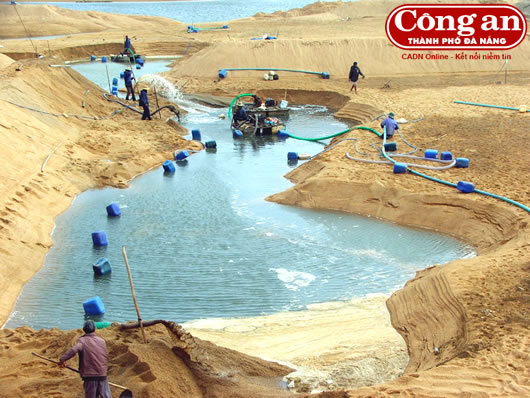 Toàn cảnh hút cát, lấn đất rừng phòng hộ ven biển Đa Ngư làm hồ tôm trái phép. |