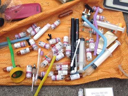 (Cadn.com.vn) - 9 giờ 30 ngày 20-9, Phòng CSĐTTPVKT&CV phối hợp với Tổ công tác đặc biệt số 3- CA tỉnh Nghệ An phát hiện, bắt giữ ô-tô BKS 79D-5732 do Hồ Duy Ngà (1970, trú P. Cửa Nam, TP Vinh, Nghệ An) điều khiển chở nhiều dụng cụ sử dụng ma túy “đá” và dao, kiếm các loại. Qua kiểm tra, lực lượng CA thu giữ: 4 bật lửa khò, 3 bình xịt gas, 6 cóng; 5 lọ nước Dolcontral; 5 viên thuốc màu đỏ, 1 gói thuốc dạng cỏ nghi là ma túy; 2 dao, 3 kiếm dài, 1 viên đạn và 2 BKS 29P-2268.
