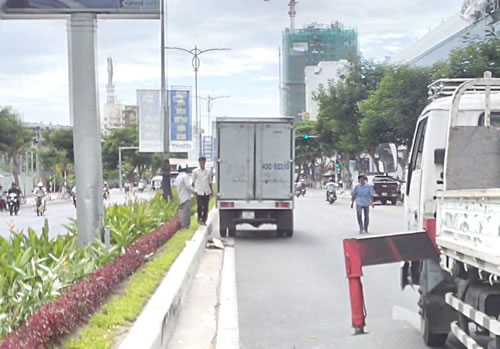 (Cadn.com.vn) - 9 giờ 30 ngày 18-6, nhiều người đi trên đường Nguyễn Văn Linh về hướng cầu Rồng (Đà Nẵng) chứng kiến ô-tô tải BKS 43C-02310 diễn "túy quyền" khi nhấc bổng 2 bánh (trước và sau) leo lên dải phân cách cao khoảng 40cm. Sau cú làm xiếc ngoạn mục, một trụ quảng cáo hư hỏng, chiếc xe móp đầu và không thể tự xuống đường được mà phải nhờ đến xe cẩu giải cứu. Theo tiết lộ của tài xế, nguyên nhân là do lạc tay lái.