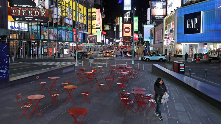 Quảng trường Thời Đại ở New York, Mỹ vắng hoe trong mùa dịch Covid-19. Ảnh: AP |