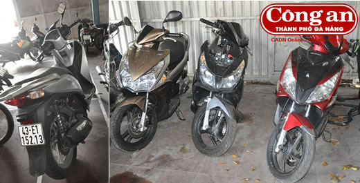 | Chiếc xe SH màu đỏ của chị Nguyễn Thị Phượng đã bị sơn lại thành màu trắng và 3 chiếc xe Air Blade do các đối tượng trộm cắp được CAQ Sơn Trà thu giữ. |