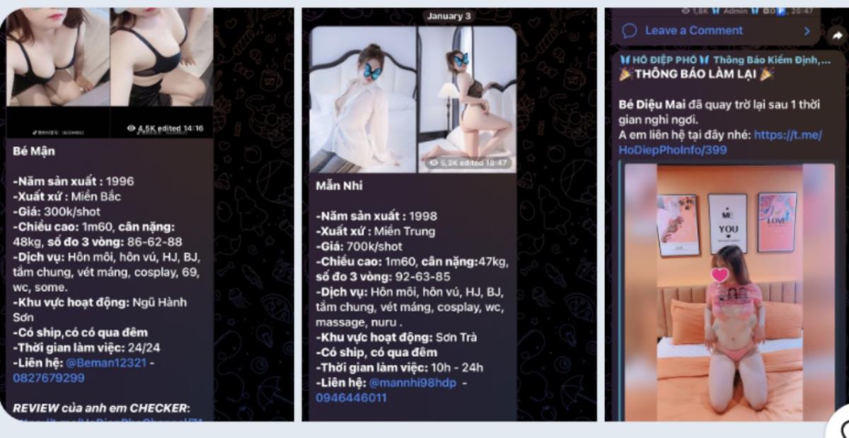 Theo điều tra, từ tháng 6-2021 đến nay, Khoa đã tạo lập các trang, nhóm, group Telegram có tên: “H.Đ.P Đà Nẵng”, “H.Đ.P Đà Nẵng - nhóm VIP”, “H.Đ.P - Tổng hợp thông tin, hình ảnh” và “H.Đ.P - Thông báo kiểm định” để thực hiện hành vi môi giới mại dâm trên không gian mạng. Riêng nhóm Telegram “H.Đ.P” có khoảng 15.000 thành viên, tài khoản tham gia.