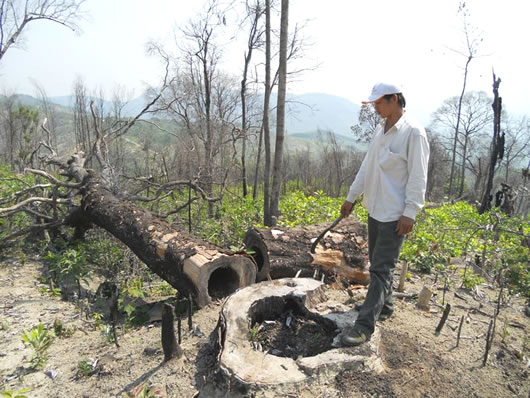 Một cây dầu rái có đường kính lên tới hơn 1m bị triệt hạ, đốt phá không thương tiếc. |