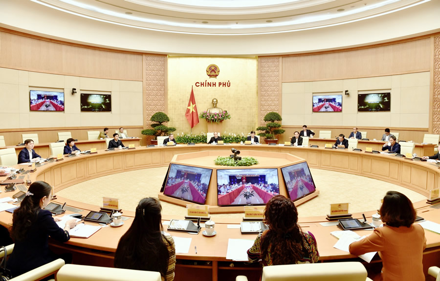 Thủ tướng Nguyễn Xuân Phúc chủ trì hội nghị tại điểm cầu Hà Nội. Ảnh VGP |