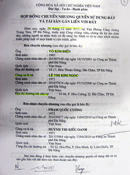 | Dù đã ly hôn được 4 năm nhưng hợp đồng chuyển nhượng quyền sử dụng đất (ngày 29-12-2011) vẫn có tên đầy đủ của vợ chồng ông Võ Kim Điền- bà Lê Thị Kim Ngọc. |