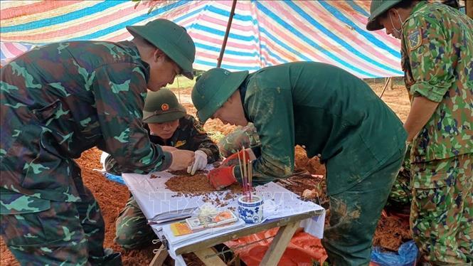 Lực lượng thuộc Quân khu 4 quy tập, cất bốc các hài cốt liệt sỹ. Ảnh: TTXVN