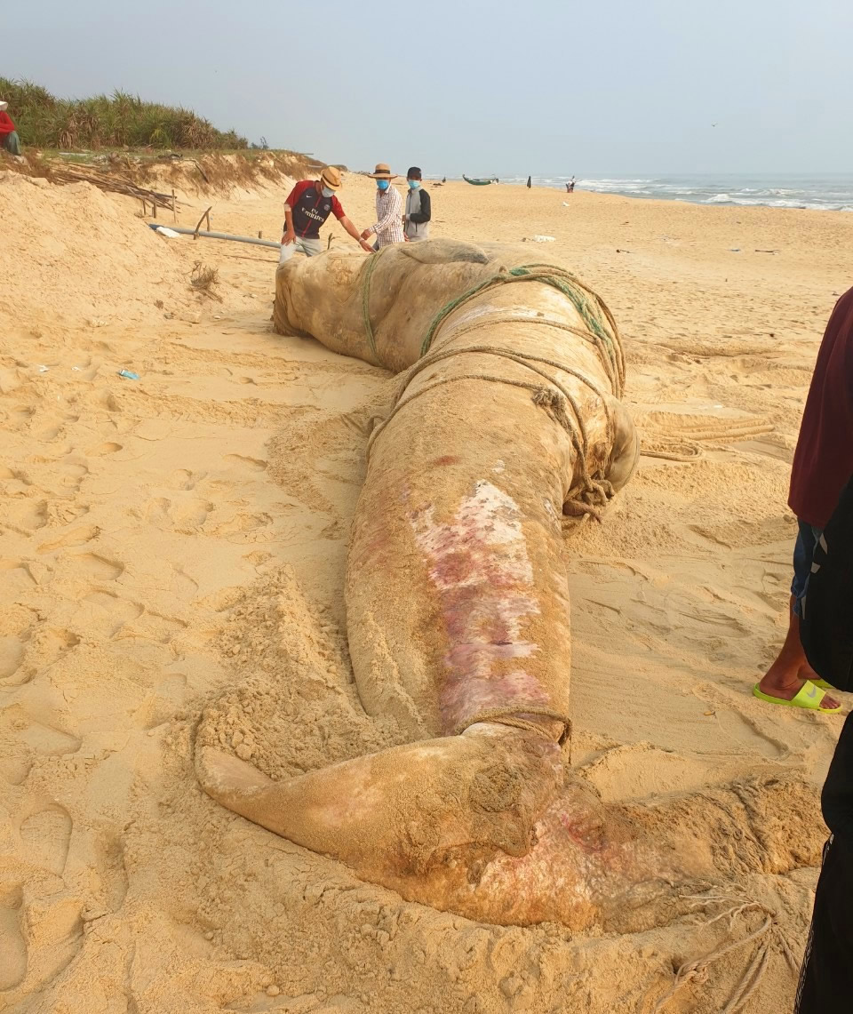 Xác cá voi “khủng” dài hơn 8 mét trôi dạt vào xã Bình Nam. |
