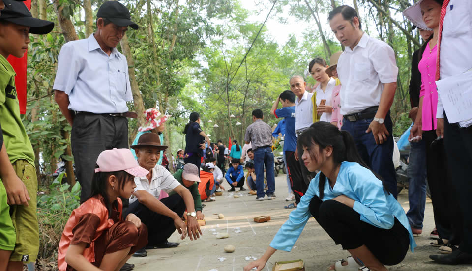 Thế hệ trẻ Hòa Nhơn tái hiện trò chơi dân gian "Ô ăn quan" tại lễ hội đình làng Phước Hưng. |