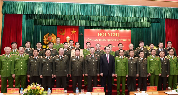 Ngay sau khi kết thúc chương trình thảo luận, cuối buổi sáng 27-12, Chủ tịch nước Trần Đại Quang đã có bài phát biểu quan trọng, bày tỏ vui mừng khi đến thăm, gặp mặt các đồng chí dự Hội nghị. "Đây là dịp để tôi bày tỏ sự tri ân về quá trình dìu dắt, giúp đỡ của các thế hệ đàn anh đi trước; sự cộng tác, giúp đỡ của tất cả mọi người trong quá trình tôi công tác ở lực lượng CAND với tư cách là Bí thư Đảng ủy CAT.Ư, Bộ trưởng Bộ CA nhiệm kỳ vừa qua. Bởi từ khi được Quốc hội bầu làm Chủ tịch nước, tôi chưa có dịp nào được gặp mặt đông đủ các đồng chí lãnh đạo các đơn vị ở Bộ và CA các địa phương như hôm nay"- Chủ tịch nước chia sẻ.