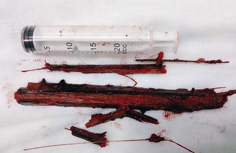 Tại đây, sau khi thăm khám và chụp CT lồng ngực, các y, bác sĩ phát hiện có ổ áp xe phổi phải kèm theo dị vật từ ngực sau bên phải, cạnh cột sống đâm thấu phổi phải lên đỉnh phổi. Các bác sĩ Khoa Ngoại tổng hợp và Khoa Chấn thương tiến hành phẫu thuật thì phát hiện xương sườn số 8 bị gãy do dị vật đâm trúng gây ra viêm xương, áp xe phổi phải. Các bác sĩ đã tập trung xử lý và lấy được cành tro khô dài hơn 20cm ra khỏi cơ thể bà H.