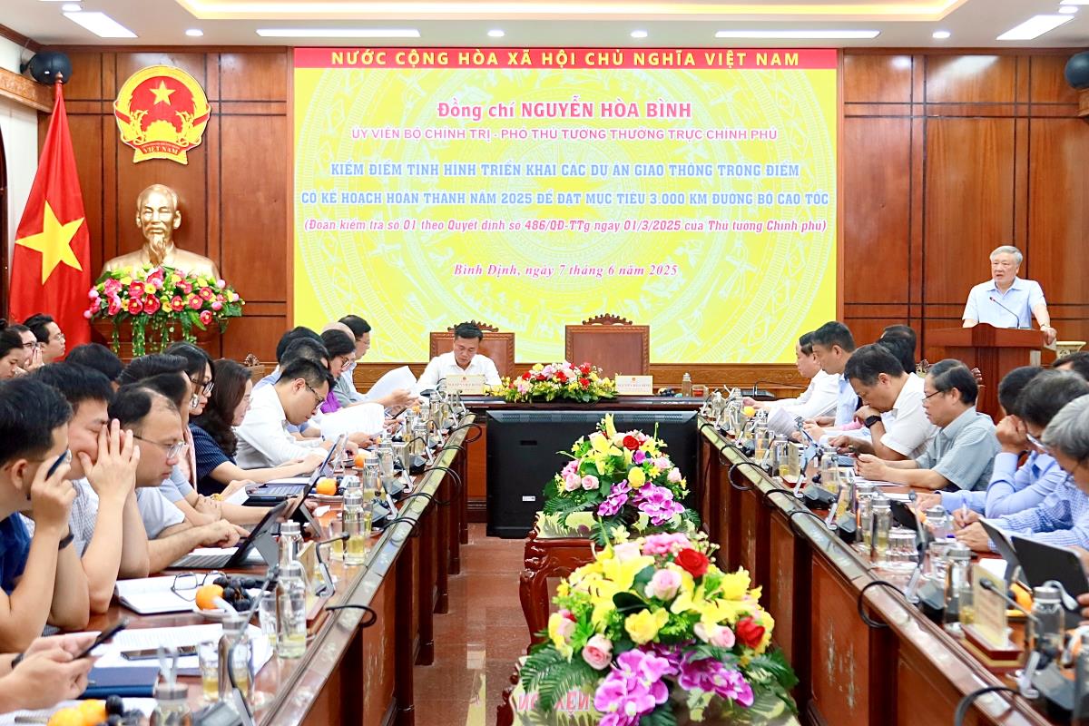 Ngày 7-6, tại tỉnh Bình Định, Phó Thủ tướng Thường trực Chính phủ Nguyễn Hòa Bình cùng Đoàn Kiểm tra số 1 của Chính phủ đã có buổi làm việc với các địa phương, chủ đầu tư và nhà thầu thi công kiểm điểm tình hình triển khai các dự án giao thông trọng điểm có kế hoạch hoàn thành trong năm 2025 để đạt được mục tiêu 3.000km đường bộ cao tốc.