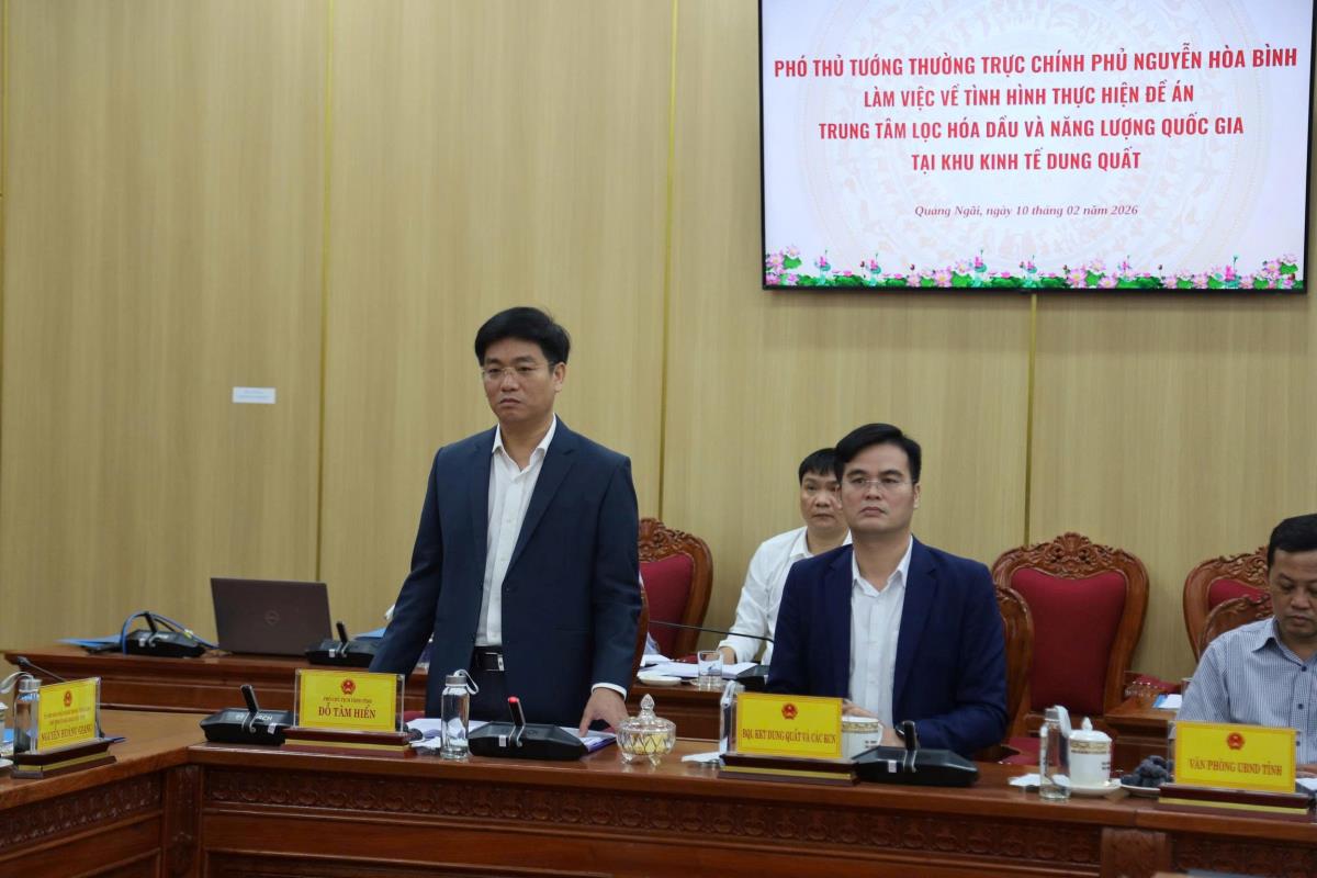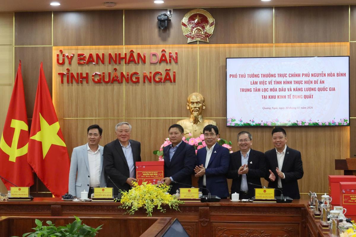 Sáng 10-2, Đoàn công tác của Chính phủ do Phó Thủ tướng Thường trực Chính phủ Nguyễn Hòa Bình dẫn đầu đã có buổi làm việc với tỉnh Quảng Ngãi nhằm đánh giá tình hình triển khai Đề án Trung tâm lọc hóa dầu và năng lượng quốc gia tại Khu Kinh tế Dung Quất.