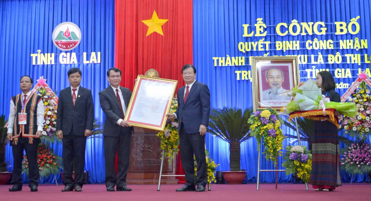 Tối ngày 25-9, tại Hội trường 19/5 (TP Pleiku, Gia Lai) đã diễn ra Lễ đón nhận Quyết định của Thủ tướng Chính phủ công nhận TP Pleiku là đô thị loại I trực thuộc tỉnh Gia Lai. Dự buổi lễ có Phó Chủ tịch Quốc hội nước Cộng hòa xã hội Chủ nghĩa Việt Nam Uông Chu Lưu, Phó Thủ tướng Chính phủ Trịnh Đình Dũng, lãnh đạo các ban, bộ ngành T.Ư đại diện lãnh đạo các tỉnh Tây Nguyên và đông đảo chính quyền, nhân dân các dân tộc tỉnh Gia Lai.