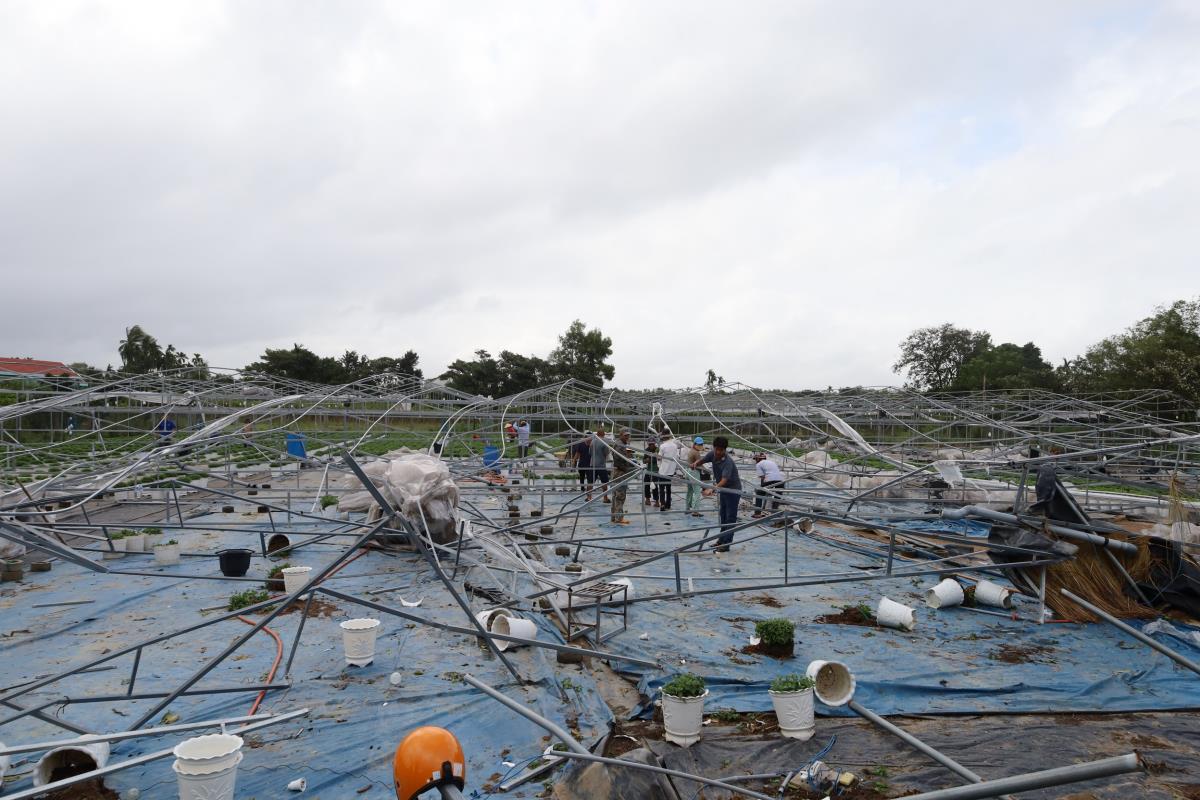 Cũng tại thôn Hòa Lang, lốc xoáy làm sập giàn sắt 3.000m2 vườn hoa của hộ ông Nguyễn Nhân khiến 4.000 chậu hoa cúc trồng để bán Tết bị ảnh hưởng, trong đó có hàng trăm chậu bị hư hỏng. Sáng nay, đoàn viên thanh niên cùng người dân địa phương đã đến dọn dẹp, giúp hộ ông Nhân khắc phục hậu quả thiên tai…