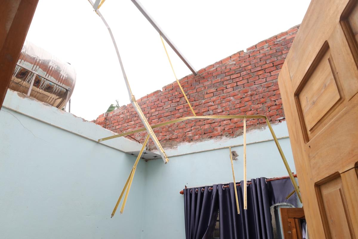 “Trước khi lốc xoáy xảy ra, 3 đứa con vẫn chơi ở phòng trên. Tuy nhiên khi đến giờ đi ngủ, 3 đứa nhỏ cùng tôi và bà qua phòng phía dưới để ngủ. Khoảng 5 phút sau thì lốc xoáy ào tới. Chỉ vài giây nhưng nghe tiếng ầm ầm rất kinh khủng. Khi gió lặng tôi ra khỏi phòng thì thấy toàn bộ mái nhà đã bị cuốn bay, la-phông, vật dụng thì đổ nát”- chị Nga kể lại.