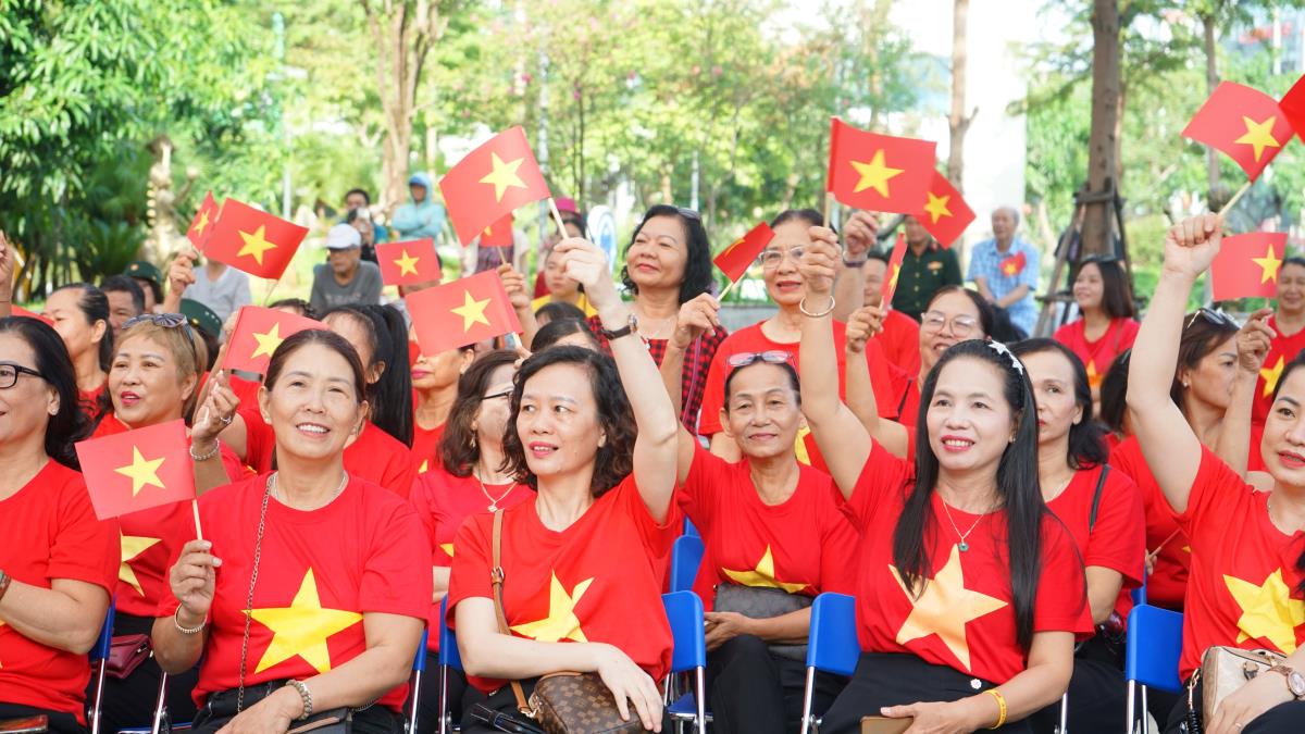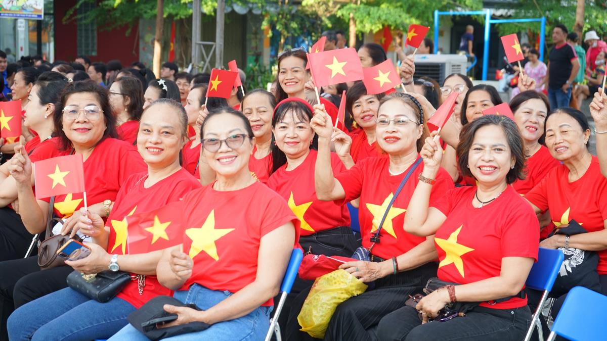 Tiếng vỗ tay vang lên, cờ cầm tay lại được người dân vẫy tung bay phấp phới mỗi khi đoàn quân tiến qua lễ đài, đặc biệt là khối diễu hành khí tài quân sự trên biển. Nhiều gia đình đưa con nhỏ, các cháu cùng ông bà đến xem từ sớm, chăm chú theo dõi từng hình ảnh trên màn hình. Các đoàn viên thanh niên cũng có mặt đông đảo, mang đến sức trẻ, góp phần tạo nên không khí rộn ràng.
