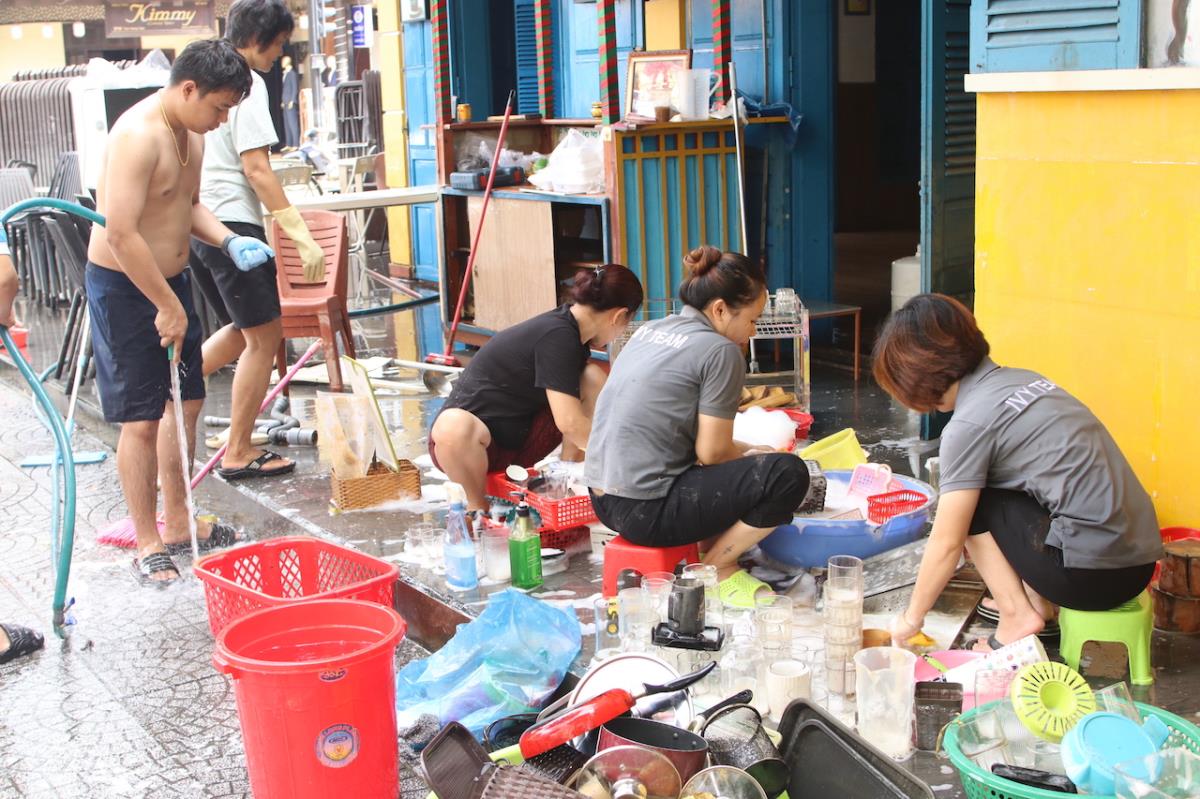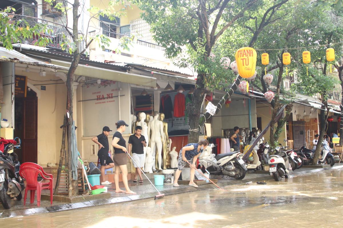 Với phương châm “nước rút đến đâu, dọn dẹp đến đó”, người dân phố cổ tất bật dọn dẹp nhà cửa, đẩy bùn non và lau rửa đồ dùng bị ngâm nước, bùn bám…
