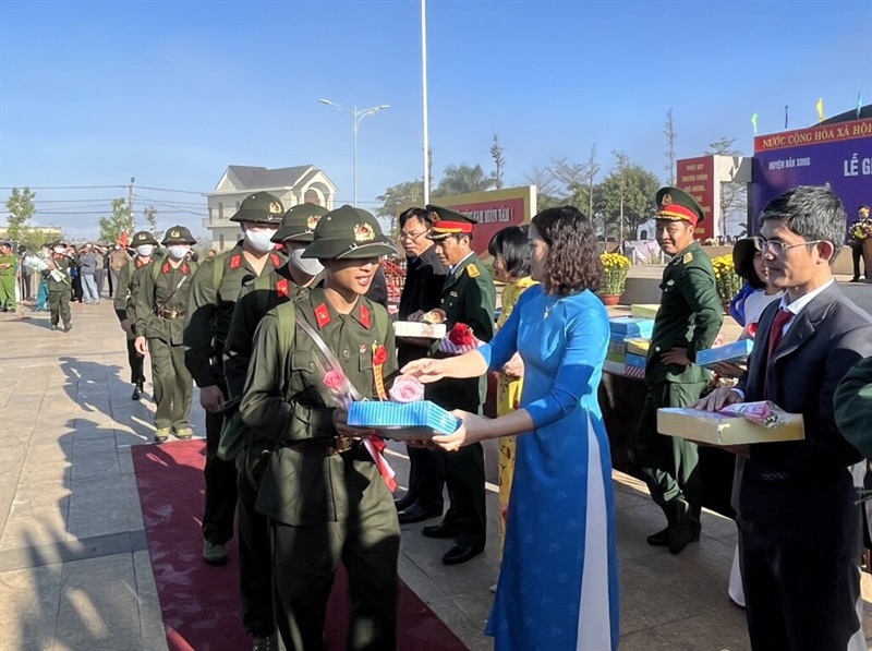 Ngay từ sáng sớm, khắp các nẻo đường về trung tâm các huyện, thành phố thuộc tỉnh Đắk Nông rực rỡ cờ hoa, băng rôn, biểu ngữ tuyên truyền tuổi trẻ hăng hái lên đường nhập ngũ bảo vệ Tổ quốc. Thời tiết những ngày đầu Xuân càng làm cho giây phút chia tay giữa các tân binh với gia đình, bạn bè, người thân thêm lưu luyến. Những cái bắt tay thật chặt, lời thăm hỏi, động viên và bó hoa tươi thắm trao tặng tân binh đã tiếp thêm niềm tin, sức mạnh để các anh phấn khởi lên đường nhập ngũ.