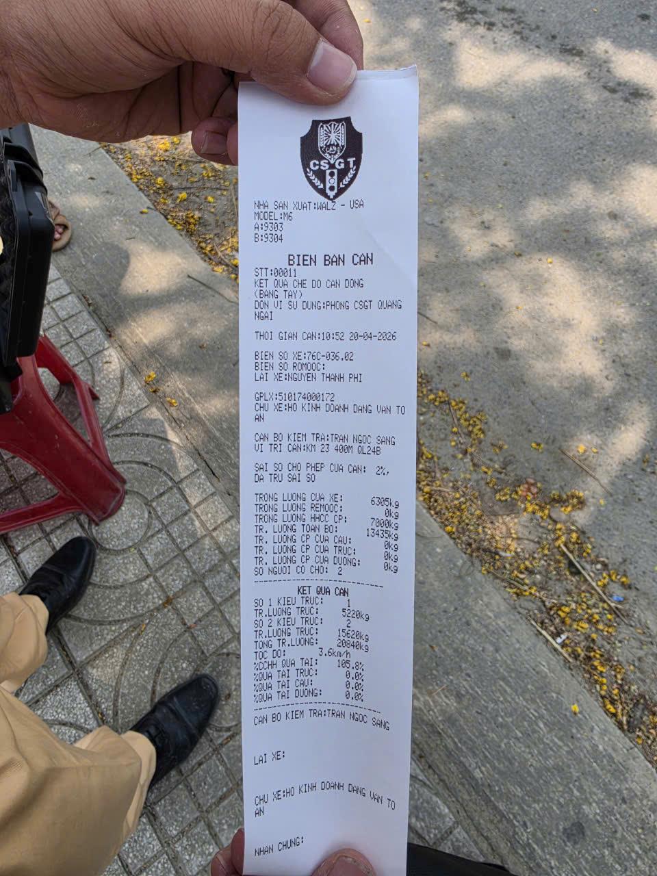 Hai phương tiện còn lại gồm xe 92C-18830 do Hồ Hữu P. (1985, xã Xuân Phú, TP Đà Nẵng) điều khiển và xe 76C-03602 do Nguyễn Thanh P. (1986, xã Ba Gia, tỉnh Quảng Ngãi) điều khiển đều vi phạm chở quá tải trên 100% theo quy định tại điểm a, khoản 7, Điều 21 Nghị định 168/2024/NĐ-CP, lần lượt là 106,1% và 105,8%, đồng thời để nước chảy xuống đường.